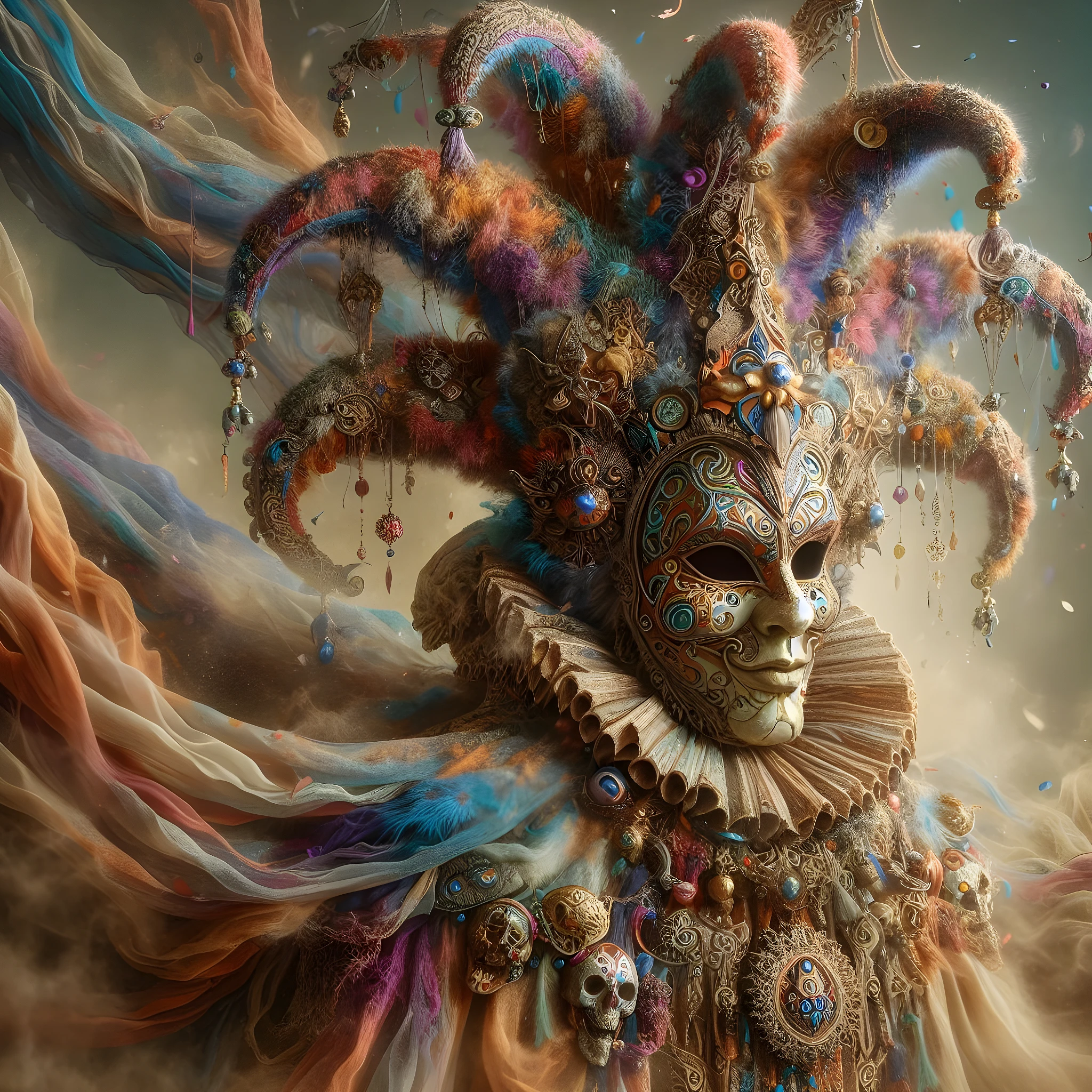Elaborate, fantastical portrait of a jester bard in a decorative costume and mask, wearing a flowing, tattered dust cloak, whimsical, theatrical, mystical, colorful, intricate textures and details, dynamic lighting, digital painting, concept art, by Greg Rutkowski and Alphonse Mucha.