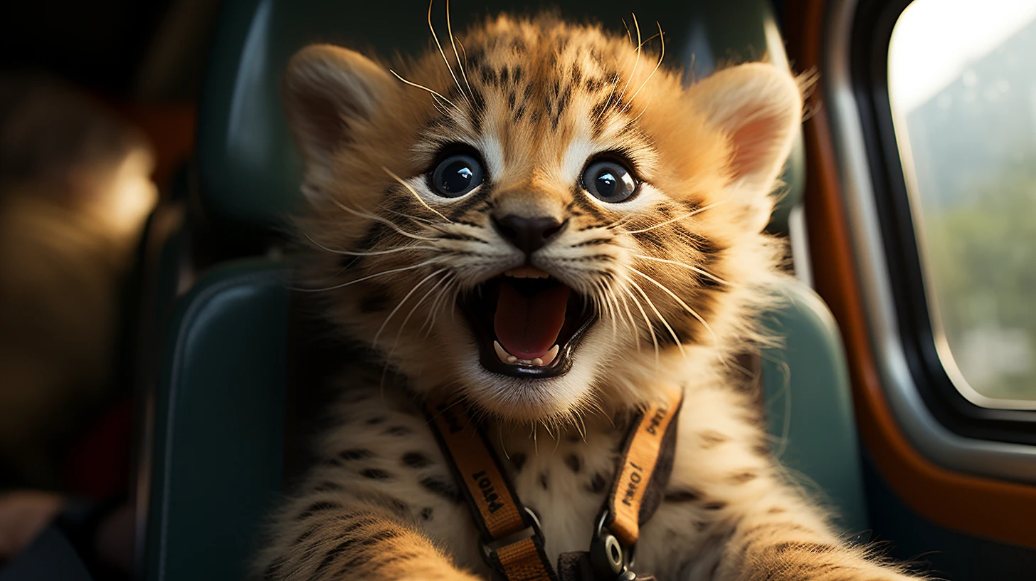 baby leopard in a car seat with open mouth, in the style of 8k, scoutcore, tilt-shift lenses, wimmelbilder, rtx, joyful chaos, pop-culture-infused