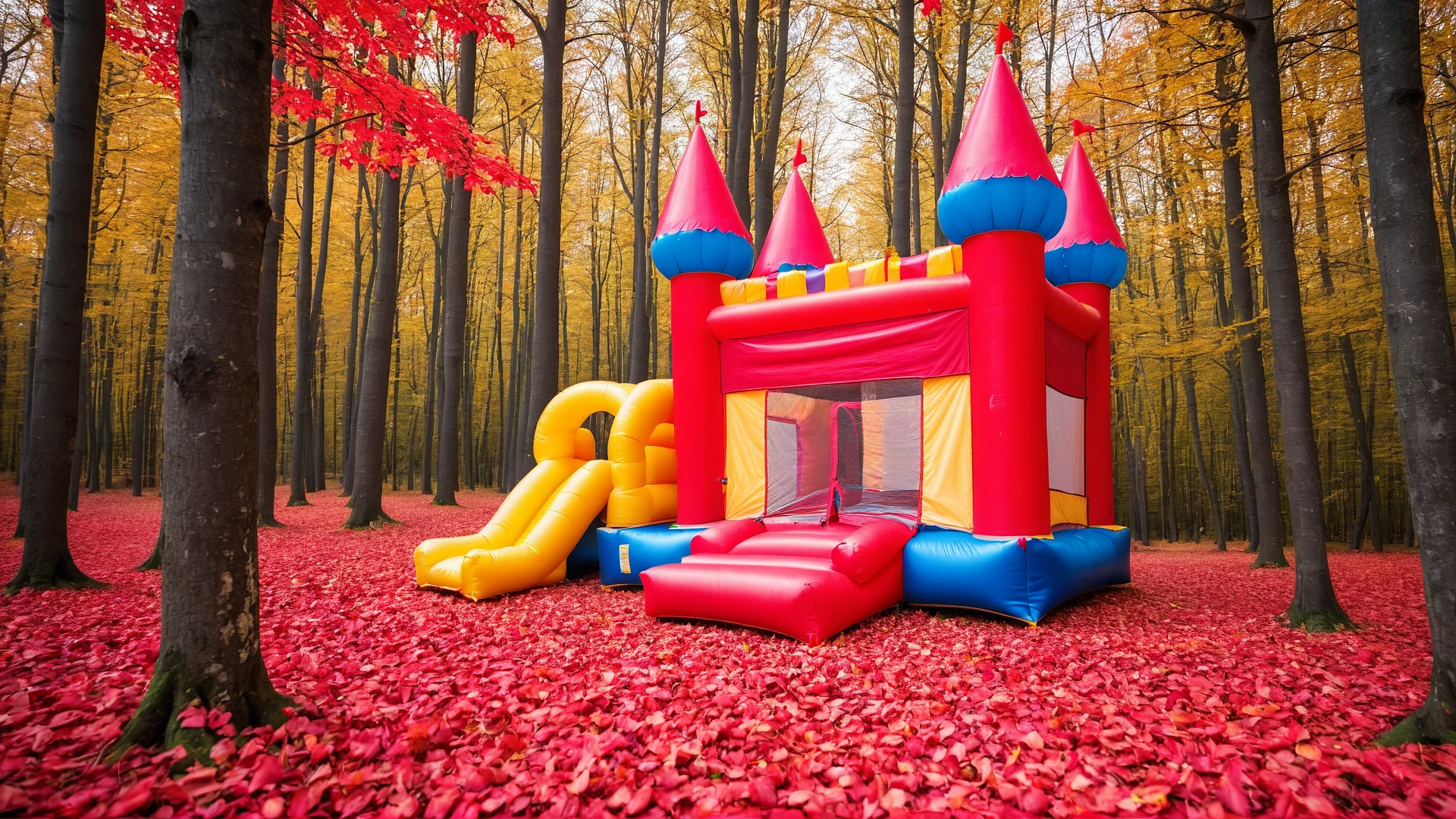 photo of a forest with red leaves and a colorful bouncing castle