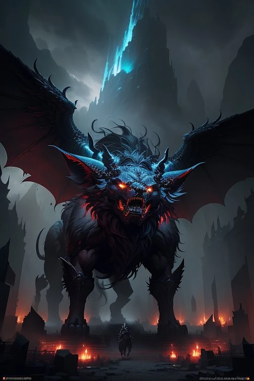 (Kerberos:1.1) , (guarding the exit from the realm of the dead:1.1) , in hades, anger, powerfull, rage, occlusion, epic wide shot, aerial perspective, darkfantasy, CGI, depth focus, dark lighting, detailed, complicated, stunning composition, complicated maximalist, by Antonio J. Manzanedo