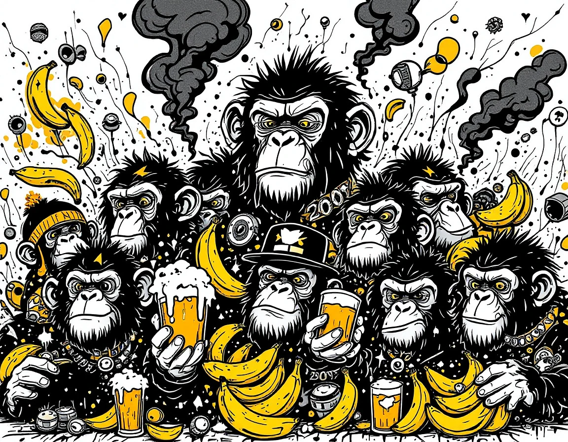 An intricate and mainly black, white, green, yellow (two contrasting, extra colors for details) , graffiti-style poster featuring various elements, such as cartoon chimp gang characters, symbols of urban culture, smoke, geometric formes, abstract lines and dynamic expressions, focusing on minimalistic chimp faces, bananas, beer, is part of the image. the word and '2007' is hidden --ar 63:128 --stylize 750