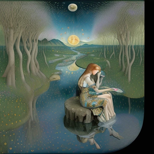 ((Bosch) ), Klimt and ((Bruegel) ) style. Perfect profile beautiful sit down full body with a ((short dress) ) ((woman) ) in a surreal and mind-blowing planet, full of translucent ((big drops) ) falling, reflecting the landscape. lots of surreal flowers and mind-blowing birds of immense shapes and colors. Sun. Several moons. XIV century style. Hyper-detailed hyper-realistic photo-fantasy ornate meticulously detailed, muted colors in, meticulous, intricate and highly detailed illustration by Bosch. ornate, meticulously detailed, muted colors, meticulous, intricate, highly detailed. Cinematic light. Work of art. Extremely detailed