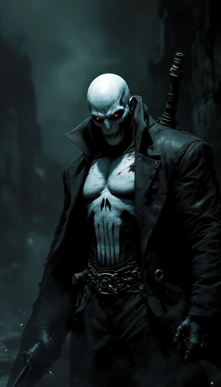dystopian style The evil grotesque Punisher. bleak, post-apocalyptic, somber, dramatic, highly detailed, dramatic, mysterious, SilverPulse