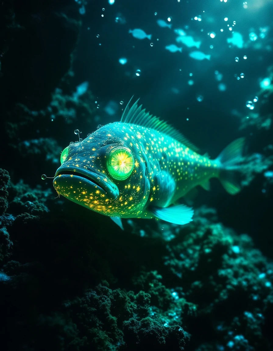 in the deepest Pacific ocean trenches strange fish with bio luminescence lure their prey.