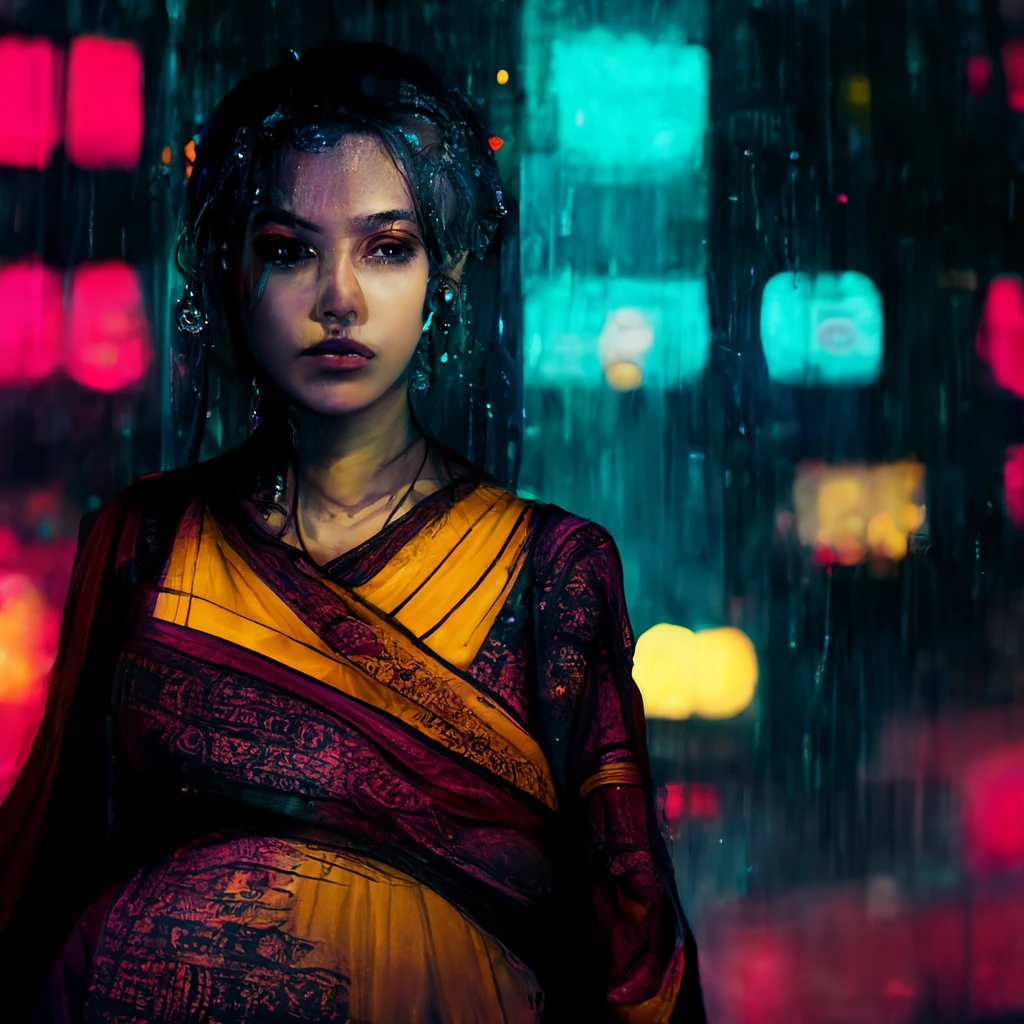 photo of beautiful pregnant woman wearing an intricate sari, cyberpunk background, 8k, raining, night, detailed, realistic