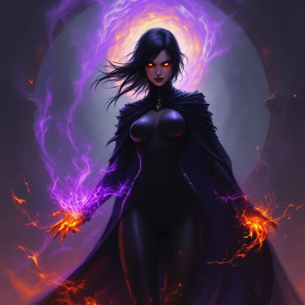 simple blurry painting in the style of warhammer 40k of a female warlock, standing infront a gothic circh, channeling pruple and orange hellfire magic, cybereyes, black tight onepiece suit, mantle with high collar, black hair, latina skin