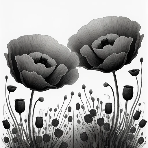 A silver ink drawing of a 2 standing high poppies on a black canvas, highest quality
