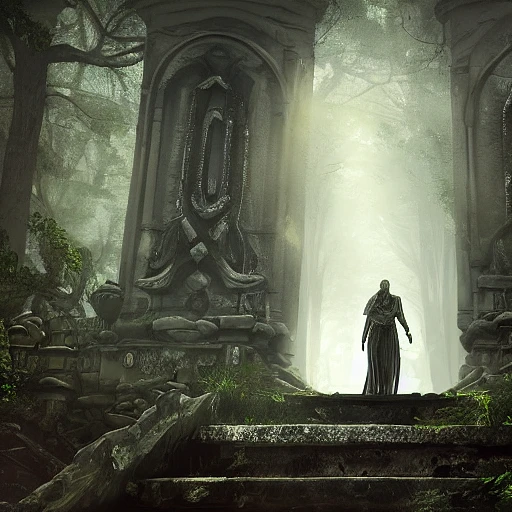 temple in ruines, forest, stairs, columns, cinematic, detailed, atmospheric, epic, concept art, Matte painting, background, mist, photo-realistic, concept art, volumetric light, cinematic epic rule of thirds octane render, 8k, corona render, movie concept art, octane render, cinematic, trending on artstation, movie concept art, cinematic composition , ultra-detailed, realistic , hyper-realistic , volumetric lighting, 8k --ar 2:3 --test --uplight
