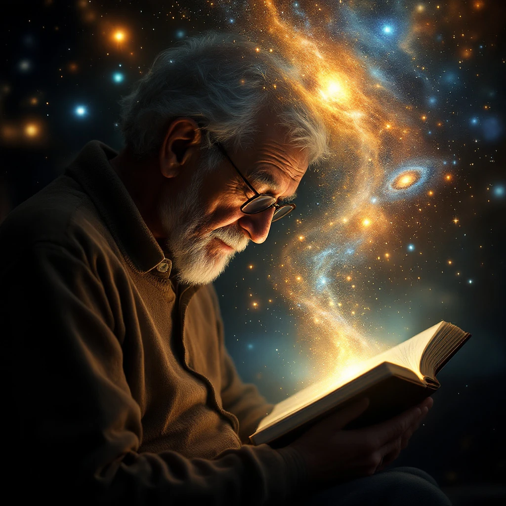 Elderly person reading a glowing book as galaxies form above their head, 3D surreal cosmic visuals with intellectual tone