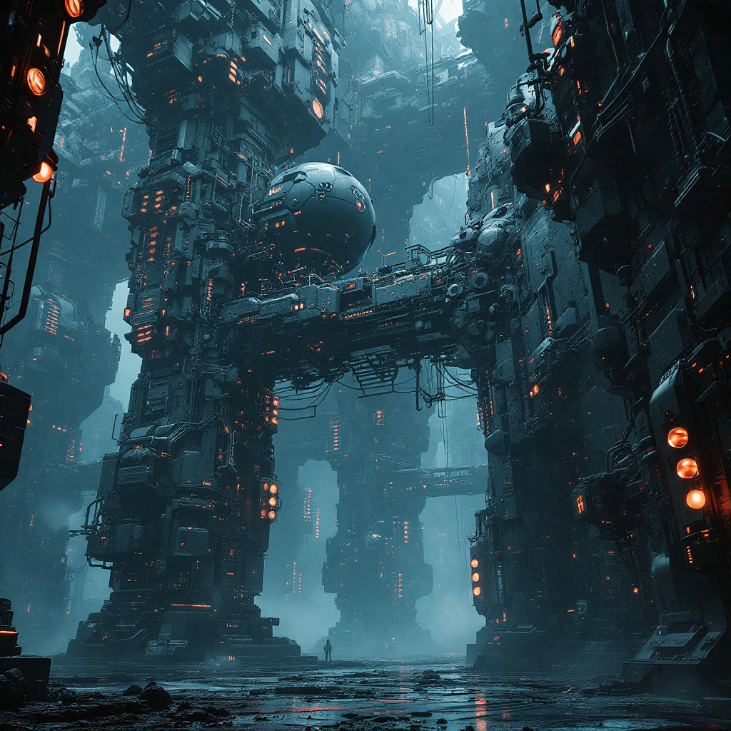 3d rendering, Tsutomu Nihei, complex system, equipment with hyper detail, future mechanical society, with orage colors , sci-fi, dystoia, super complex and giant structures backdrop, gloomy futuristic environment, fog, dramatic lighting, Unreal engine 5, RTX shader, detail texture, cyber screen, rustic, realism ambience --ar 9:16 --style raw --stylize 700