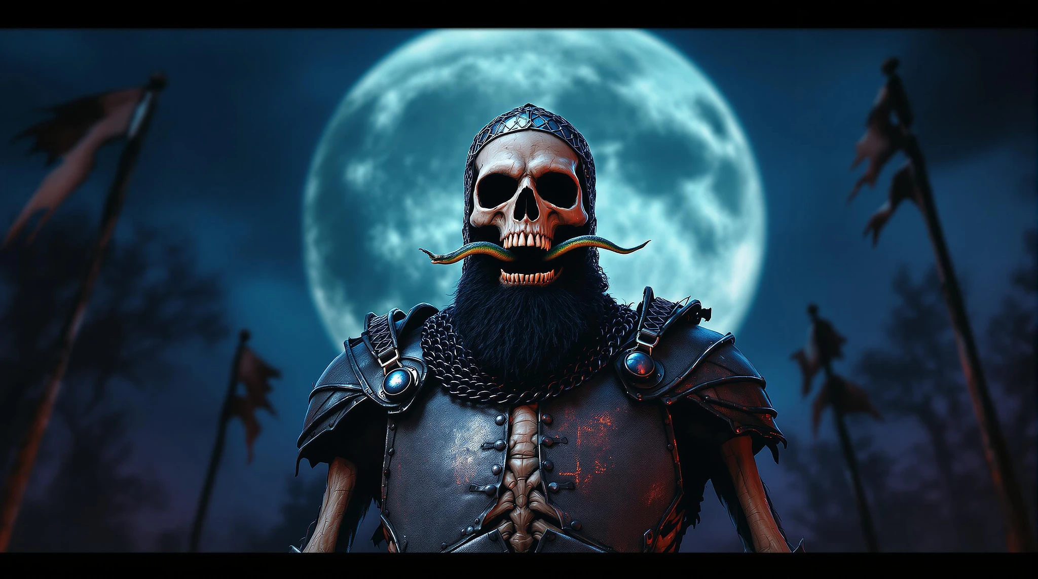 an eerie skeletal warrior standing way back in the image in front of a full moon, exuding an eerie and haunting atmosphere. The skeleton has a menacing expression, with a black beard and mustache, with a snake sticking out of the center of its mouth from within its skull and wears a chainmail headpiece, a grey breastplate, and brown gloves. The background features a full moon with a blue and purple hue, surrounded by dark silhouettes of trees and poles with torn flags. The image is a wide-angle camera perspective that adds to the dramatic effect.