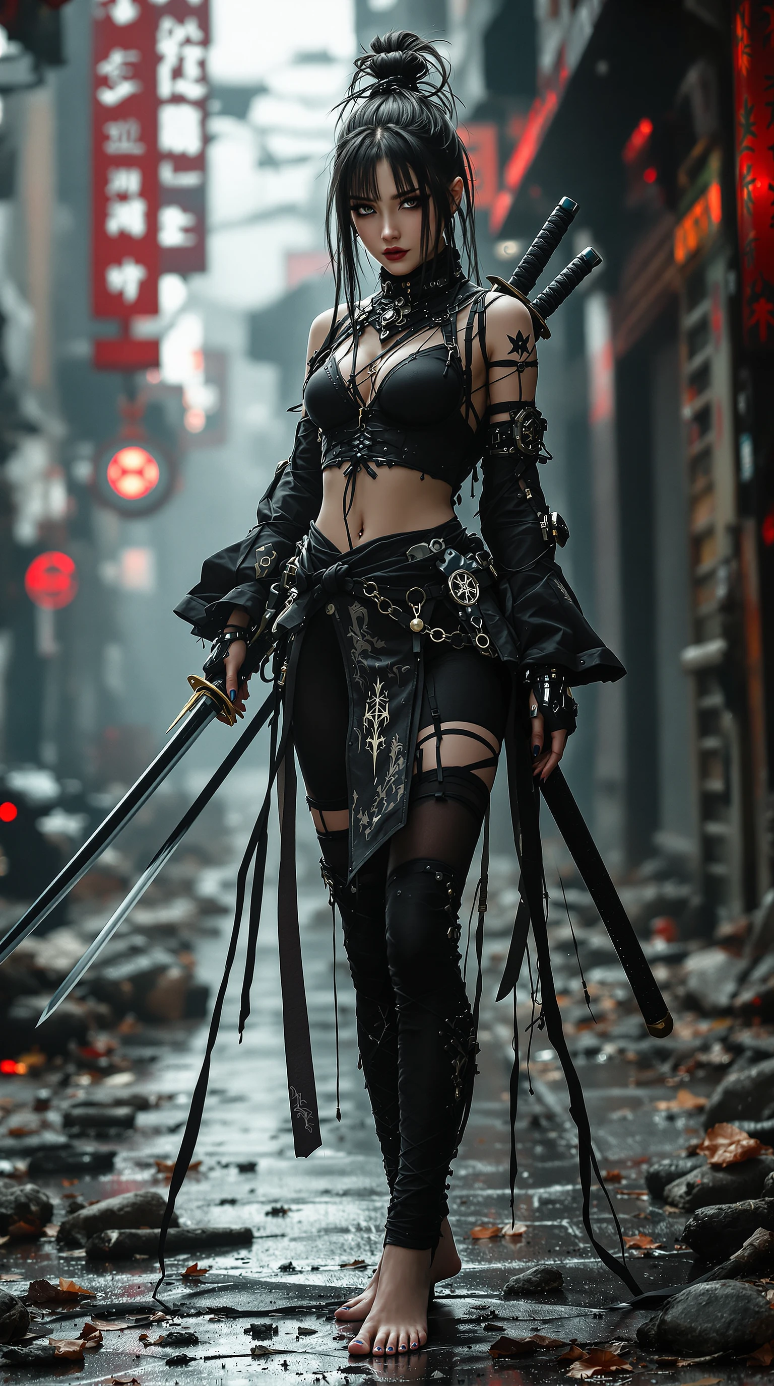 Full body view of a Gorgeous 18 years dystopian Japanese girl wearing dystopian cyberpunk punk emo qipao and black leggings, barefoot (((show foot) )), apocalypse, looking at viewer, high detail, dangerous, katana on sholder