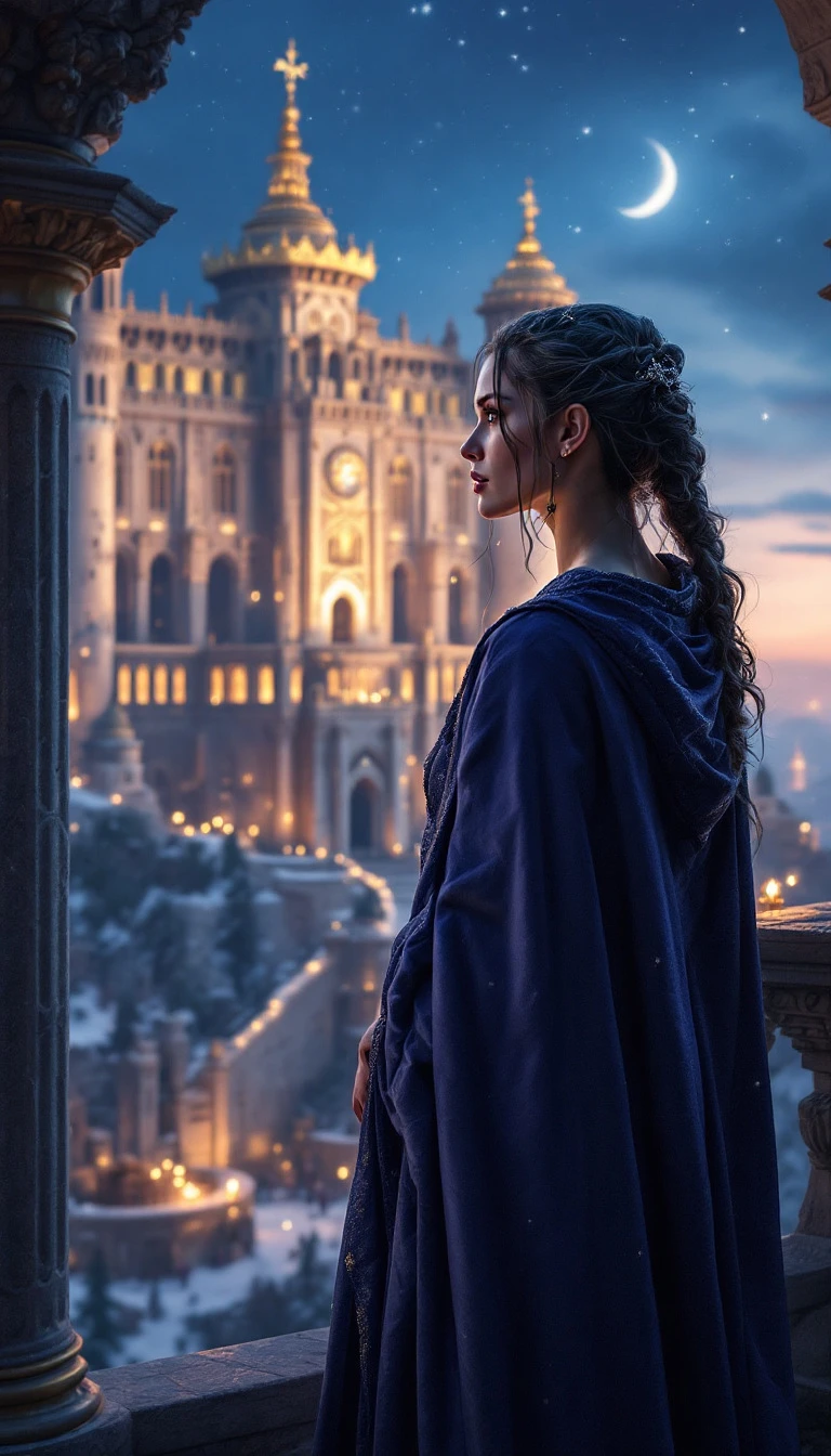 hyper realistic side pose image of a warrior queen dressed in a night robe viewing outside from her palace onto the kingdom