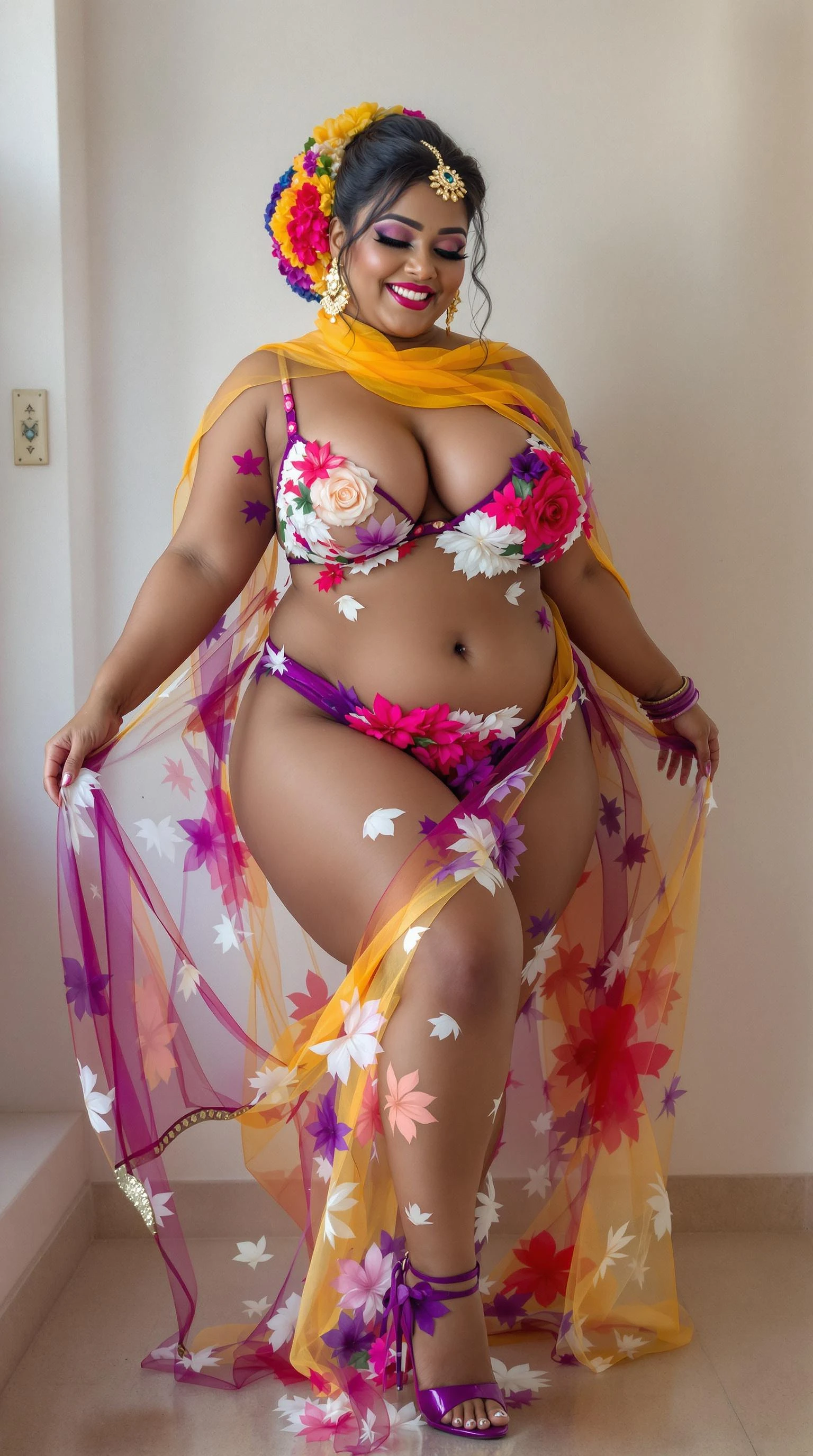 a full side front view large puffy boobs legs with high heels matched color cleavage realistic looking Sexy Indian plus size girl with sexy smiley face a slightly plus size Indian hot and sexy standing on her front cleavage she is with transparent yellow magenta red and white purple and deep purple and white colorful very thin transparent scarf on boobs see through rear of bra and tiny while panty heart capture the delicate contours of her face and the intricate details of her classic hair style black vibrant colors to capture the intensity of the flowers, her hairs styles Gorgeous Cupcake Hued Bun-Style Bridal Hairstyle, she is laughing out loud sexy, she is looking at her back with smiles
