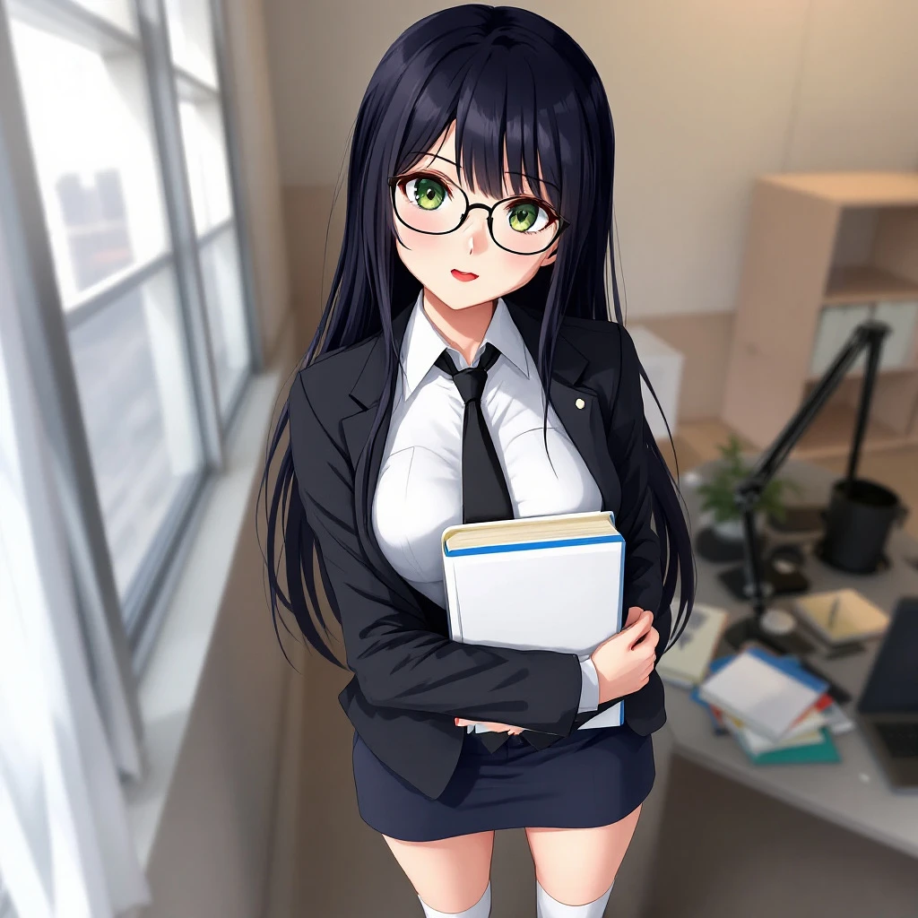 anime, woman, black hair, long hair, green eyes, black glasses, red lips, white shirt, black tie, black blazers, short dark blue skirt, white socks, black shoes, standing at an office, book in arms