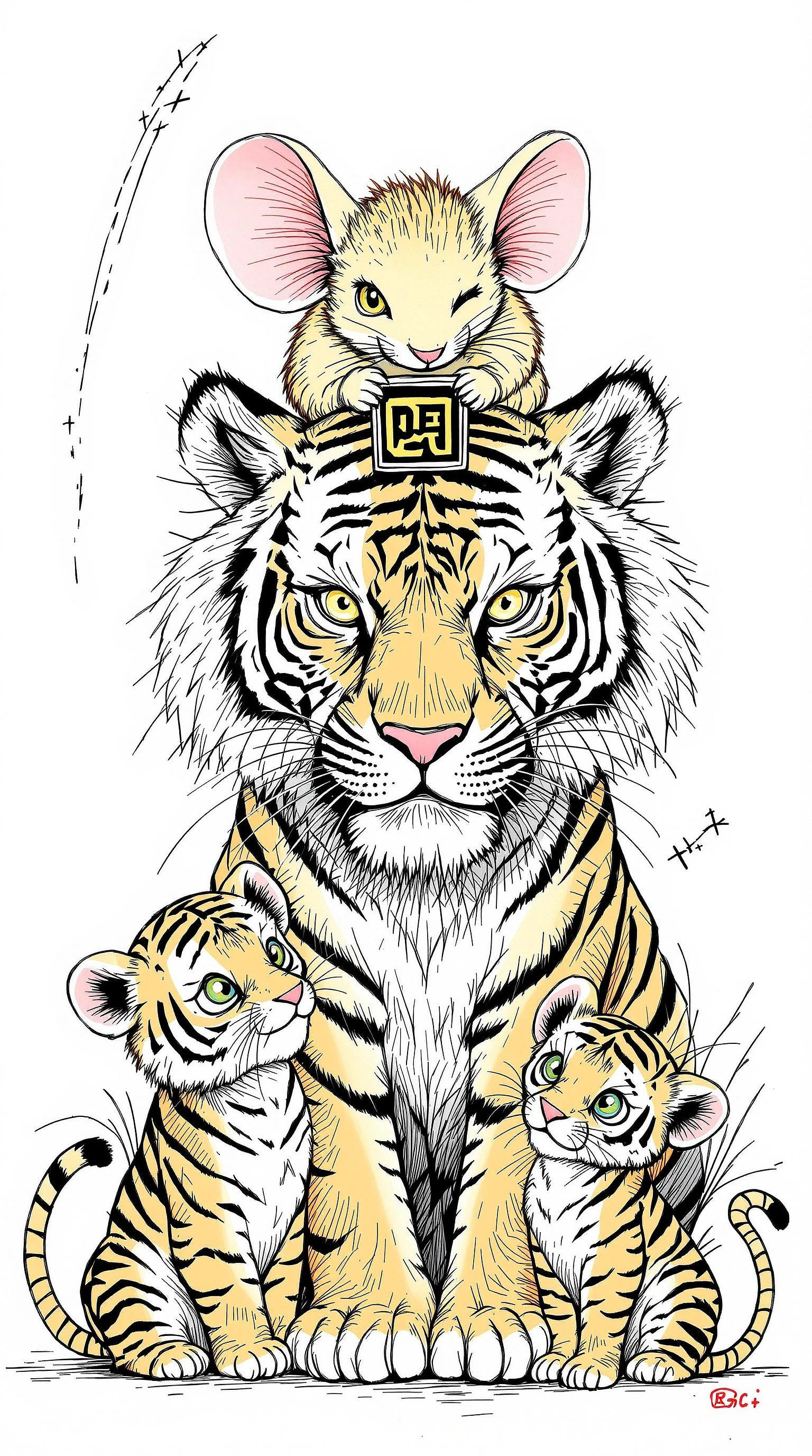 Doodle Art, a tiger and two tiger cubs, and a oversized mouse , with a mouse on the tiger's head, the mouse holding a talisman,