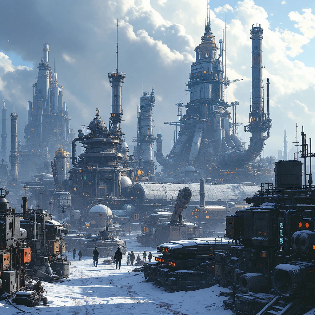 Cyberpunk city in the style of Vincent Di Fate, sci-fi illustration with a detailed and intricate design, aesthetic of industrial machinery set during daylight with a cloudy sky and snow, lighting creates a cinematic and hyper-realistic scene in high resolution --ar 63:128 --personalize 2gwf1qc --stylize 750 --v 6. 1