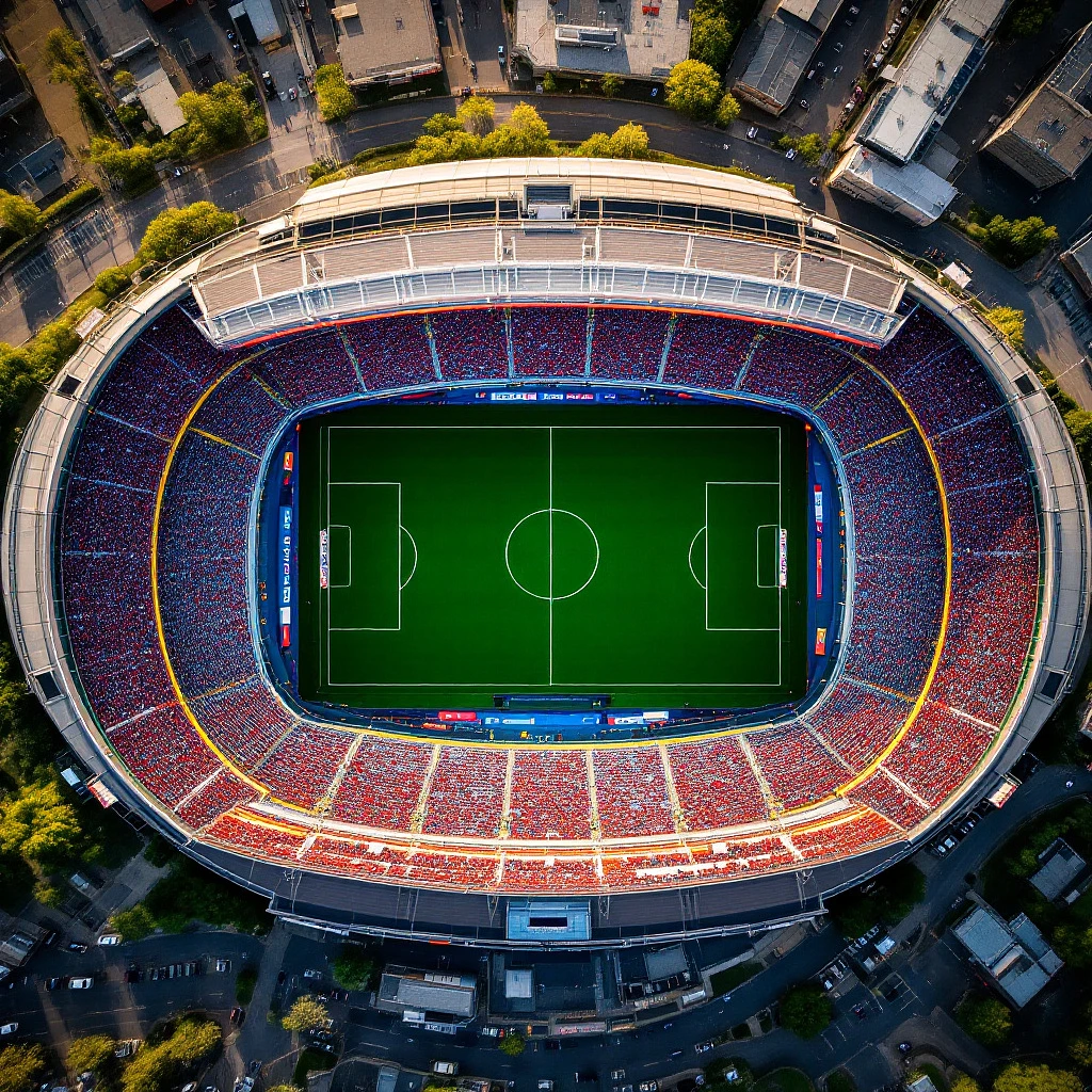“A top-down drone view of a soccer stadium filled with spectators, green pitch in perfect symmetry, high-resolution detail”