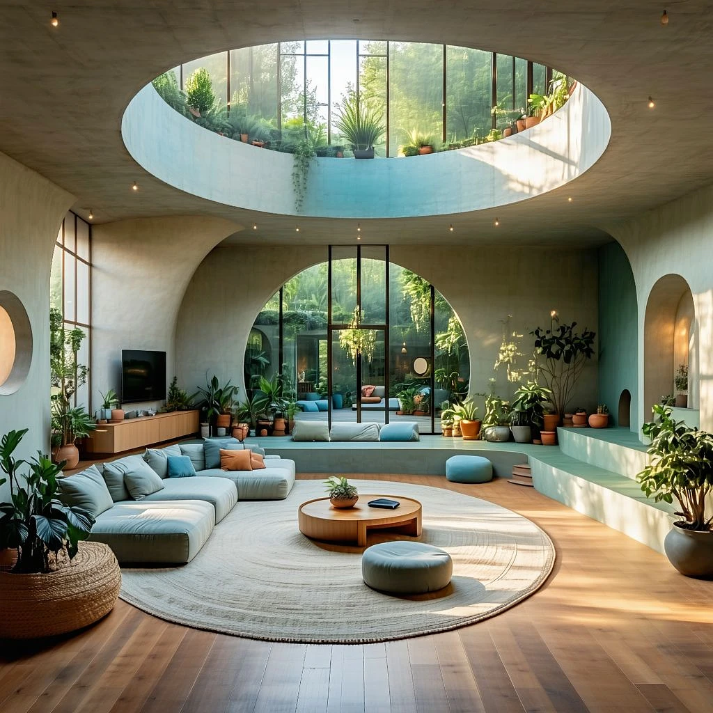 High resolution photography interior design, dreamy sunken living room conversation pit, wooden floor, small windows opening onto the garden, bauhaus furniture and decoration, high ceiling, beige blue salmon pastel palette, interior design magazine, cozy atmosphere; 8k, intricate detail, photorealistic, realistic light, wide angle, kinkfolk photography, A+D architecture