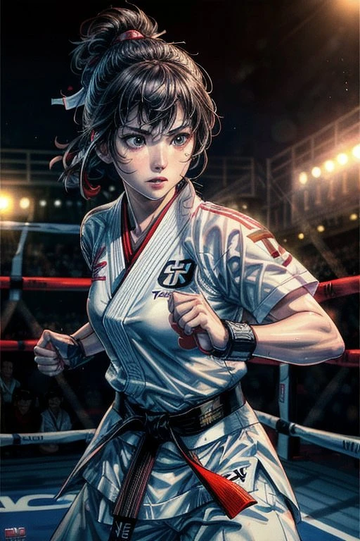 Action-packed, hyper realistic to a (Taekwondo fighters:1.3) , (white kimono:1.2) , (fighting ring and a lot of spectators in the background:1.3) , put a lot of detail in the eyes, mouth and nose, looking at viewer, portrait, photography, detailed skin, realistic, photo-realistic, 8k, highly detailed, full length frame, High detail RAW color art, diffused soft lighting, shallow depth of field, sharp focus, hyperrealism, cinematic lighting, bokeh, <lora:more_details:1>