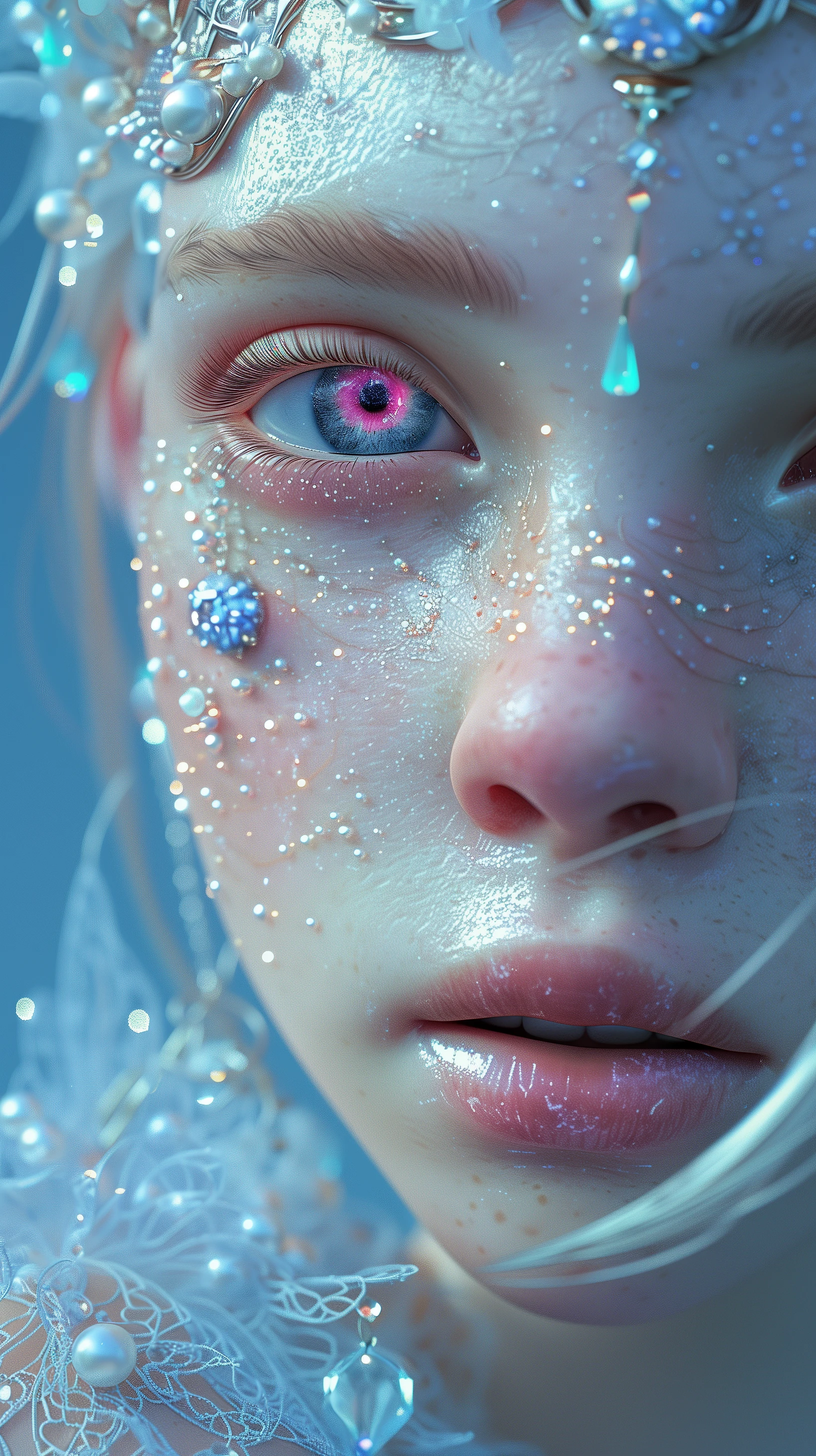 A close up of an alien woman with pink eyes and blue skin, in the fantasy art style, trending on cg society, trending in vray tracing, a beautiful blue avatar is wearing intricate jewelry around her face, the girl has pale white makeup, she wears pearl earrings and has freckles, a cute fairy child made from crystals, a cute elfish character, a closeup portrait of an elven creature, detailed character design, a beautiful pale grey background with blue highlights, hyper realistic, cinematic. --ar 9:16 --v 6. 0