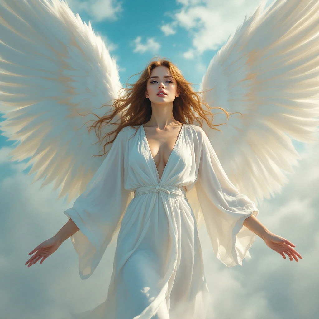 An artist's drawing of a female, a strong angel, light brown hair, a clean-shaven face, arms outstretched, and a pure white robe standing. blue sky in the background, with his huge pure white wings outstretchedcovered in cloud of smoke, whirlwind, cyan highlight colors, cyan make-up, hints of pastel, misty, seductive, sultry, breathtaking, oil painting style, artistic, aesthetic modern art, hyper-realism