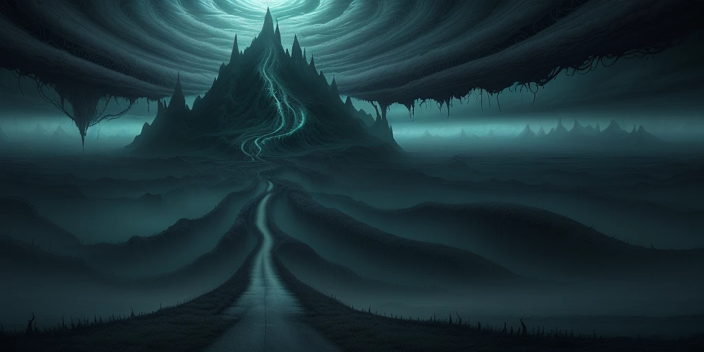 a surrealisitc dreamy-horror panoramic landscape, an unreal dreamscape in a parallel universe, a warning for those who dare ponder into its endless Harmony of horrors, a beautiful scenery, digital rendering, masterpiece, scene, hypnotic, intricate detail, unrealistic light, wide angle focused, cinematic, horrible and dreamy landscape, 4k