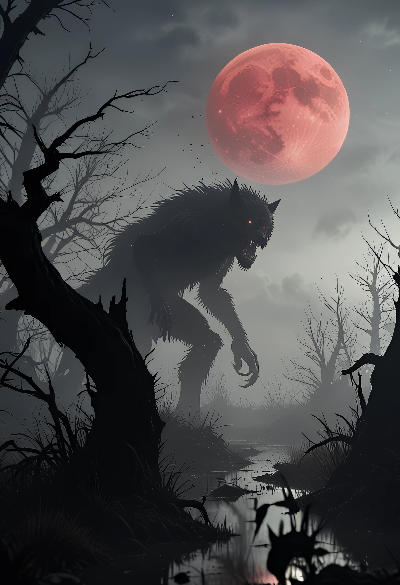something is crawling out of the misty bogs of scotland, fullmoon, a siloutte of an strong creepy werewolf, dynamic lights, 4 k, intricate details
