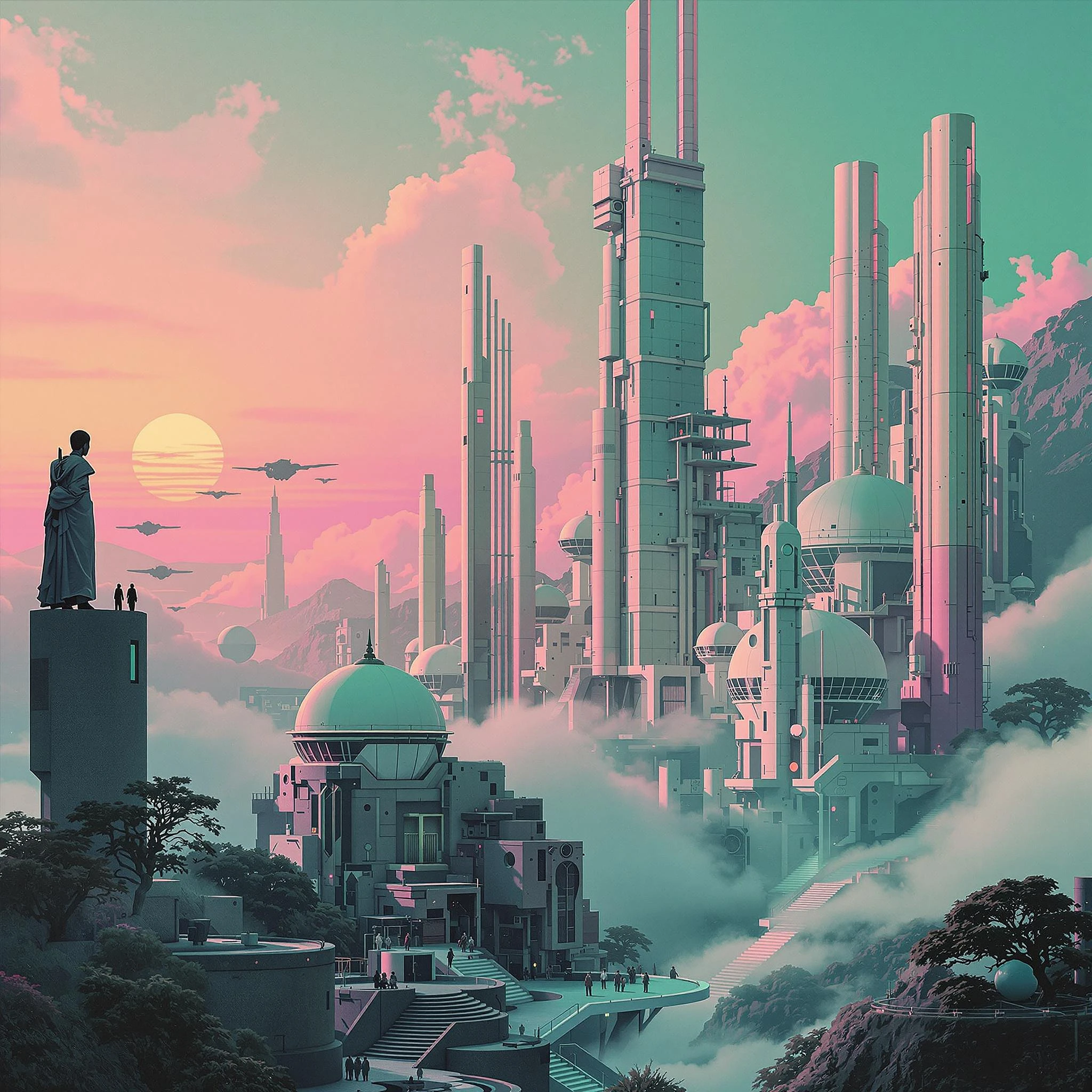 surreal architecturecore mint green and pink neo tokyo cyberpunk landscape, oriyoshi ohrai syd mead ultra - minimalist art deco, great dutch masters painting of black; realistic painting 1970s; fantasy art; pod architecture base; living modules with air locks; low lighting; art deco intricate details; god rays pastel volumetric light; eerie jean Giraud style; ultra chiaroscuro technique; --v 6. 1 -