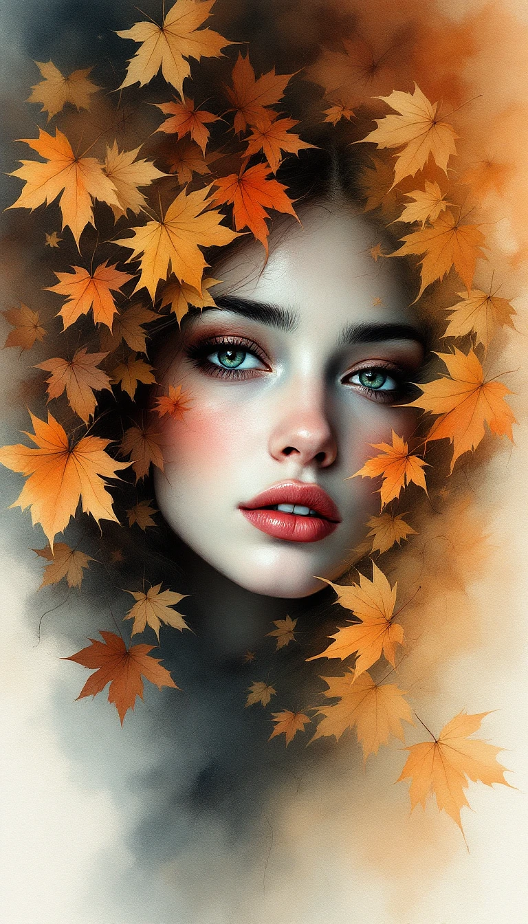 A surreal watercolor portrait of a woman's face emerging through a swirling cascade of autumn leaves. The artwork features soft, fluid brushstrokes that blend warm tones of orange and brown with contrasting cool blues and grays. The autumn leaves appear to float and flow around her face, creating an ethereal and artistic composition. The woman's expression is calm and introspective, adding a sense of mystery and depth to the dreamy scene.
