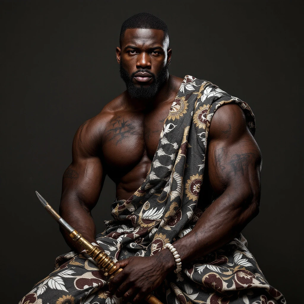 muscular African man portraite shot in agbada nigerian outfit very fit wth big shouylders and biceps and yoruba tribal marks