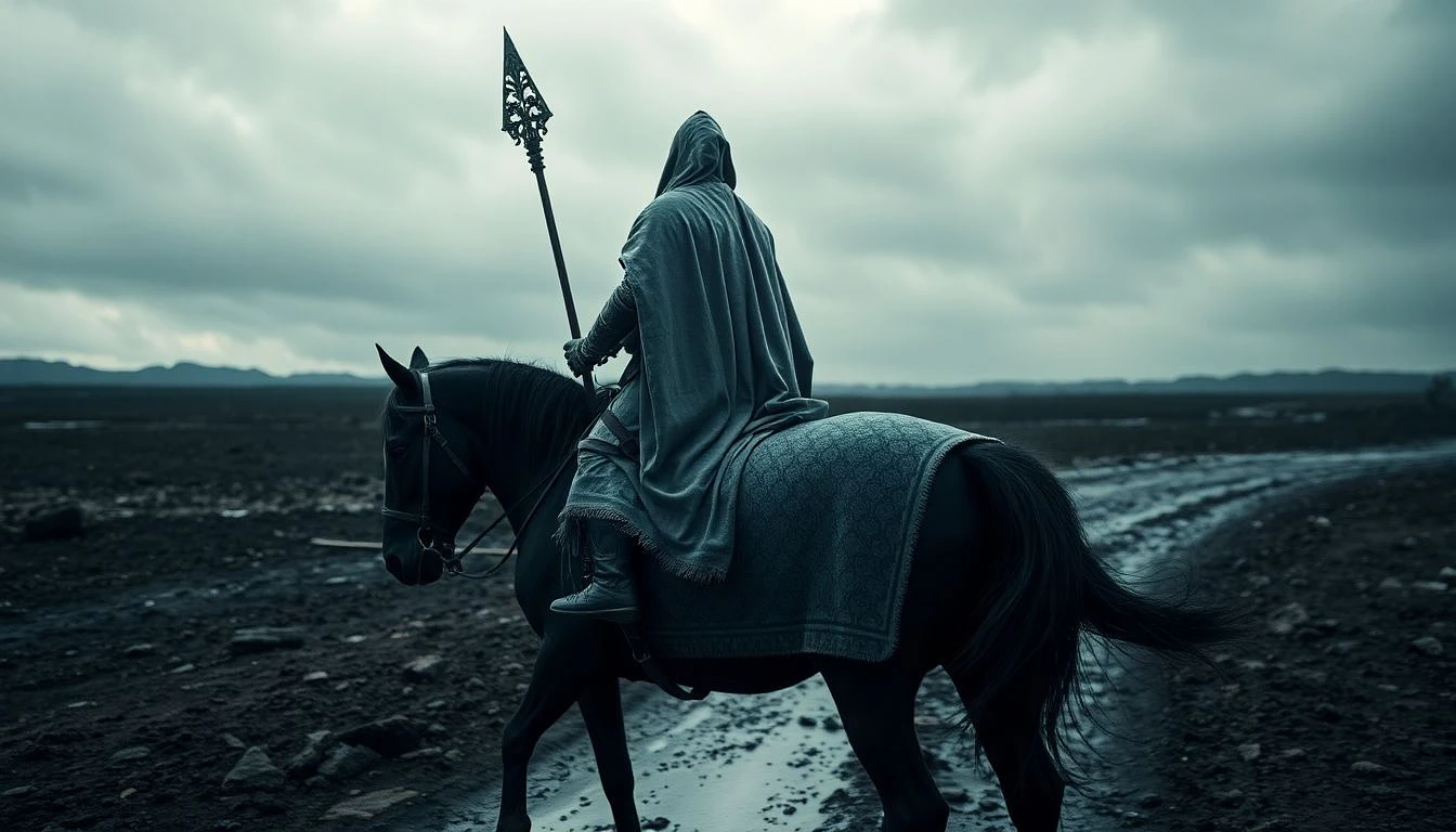 a hooded figure riding a horse through a desolate, post-apocalyptic landscape. The figure wears a grey hooded cloak with a tattered train, and grey armour, and holds a spear with an intricate design. The horse is black with a grey patterned blanket and bridle, and has a dark, flowing mane and tail. The background is a dark, cloudy sky with rain falling, and a muddy path with rocks and debris. The atmosphere is ominous, with a sense of danger and foreboding. The image is shot in a wide-angle perspective, with a grey filter and a shallow depth of field, emphasizing the figure and horse.