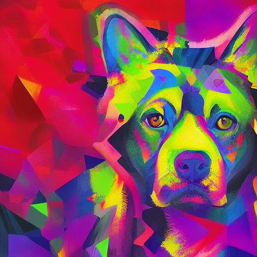 Create an abstract art piece with bold colors and sharp edges, High resolution photography: Mythical Alpha Dog