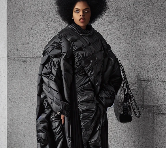 beautifully lit fashion portrait of black female marble statue with symmetrical face, the statue is wearing huge oversize quilted flowing floor length long puffer jacket by balenciaga, yeezy, y 3, yohji yamamoto, comme de garcon, rei kawakubo, drape, sharp focus, clear, detailed, , romantic, brutalist concrete architecture in the background, detailed, white, soft, symmetrical, vogue, editorial, fashion, magazine shoot, glossy