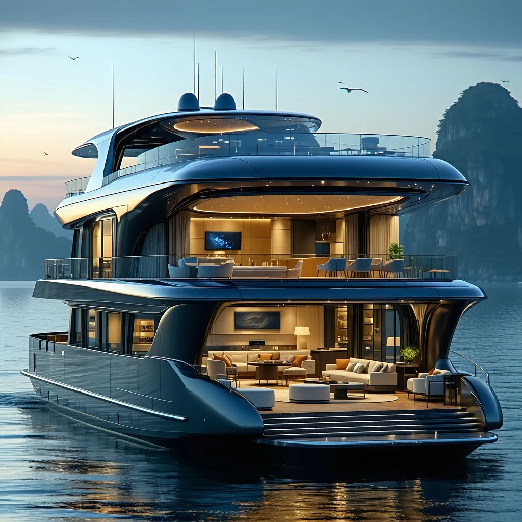 Create a futuristic 35-foot houseboat design with large open windows showcasing a luxurious interior, rich fabrics, bright colors, 2 stories, rooftop deck for entertaining, outdoor kitchen, seating area, modern architecture, sleek lines, high-tech features, and ambient lighting. The design should prioritize a sleek and modern appearance, with a focus on high-tech features and a vibrant, luxurious interior. The houseboat should offer a unique and inviting space for relaxation and entertainment, incorporating elements of futuristic and contemporary design while maintaining practicality and comfort.