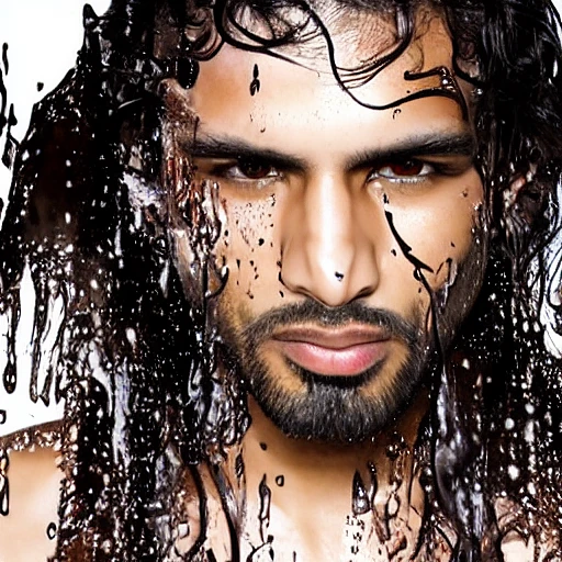 Brunette Indian man, wet brown hair, with splash of water hit over his face, serious, masculine, heroic, with facial hair, dripping, intricate details, hyper realistic water splas, fine details in skin texture, model photography, fashion photography, photography of studio, studio portrait lighting, beautiful lighting, 8K --ar 3:5 --uplight --beta --no blur