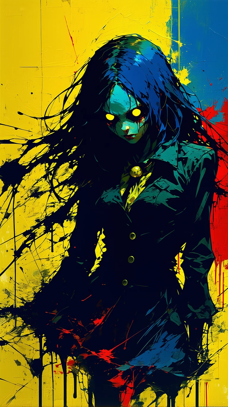 alice madness character, primary color palette, yellow, blue, red, demon eyes, long mess hair, disfigured, brutal composition, depressed, jaded, visually captivating and hauntingly beautiful, pain, sadistic, psycho, gloomy, dramatic, 4k, high quality, hd wallpaper