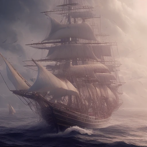 Photo of a ultra realistic sailing ship, dramatic light, pale sunrise, cinematic lighting, battered, low angle, trending on artstation, 4k, hyper realistic, focused, extreme details, unreal engine 5, cinematic, masterpiece, art by studio ghibli, intricate artwork by john william turner