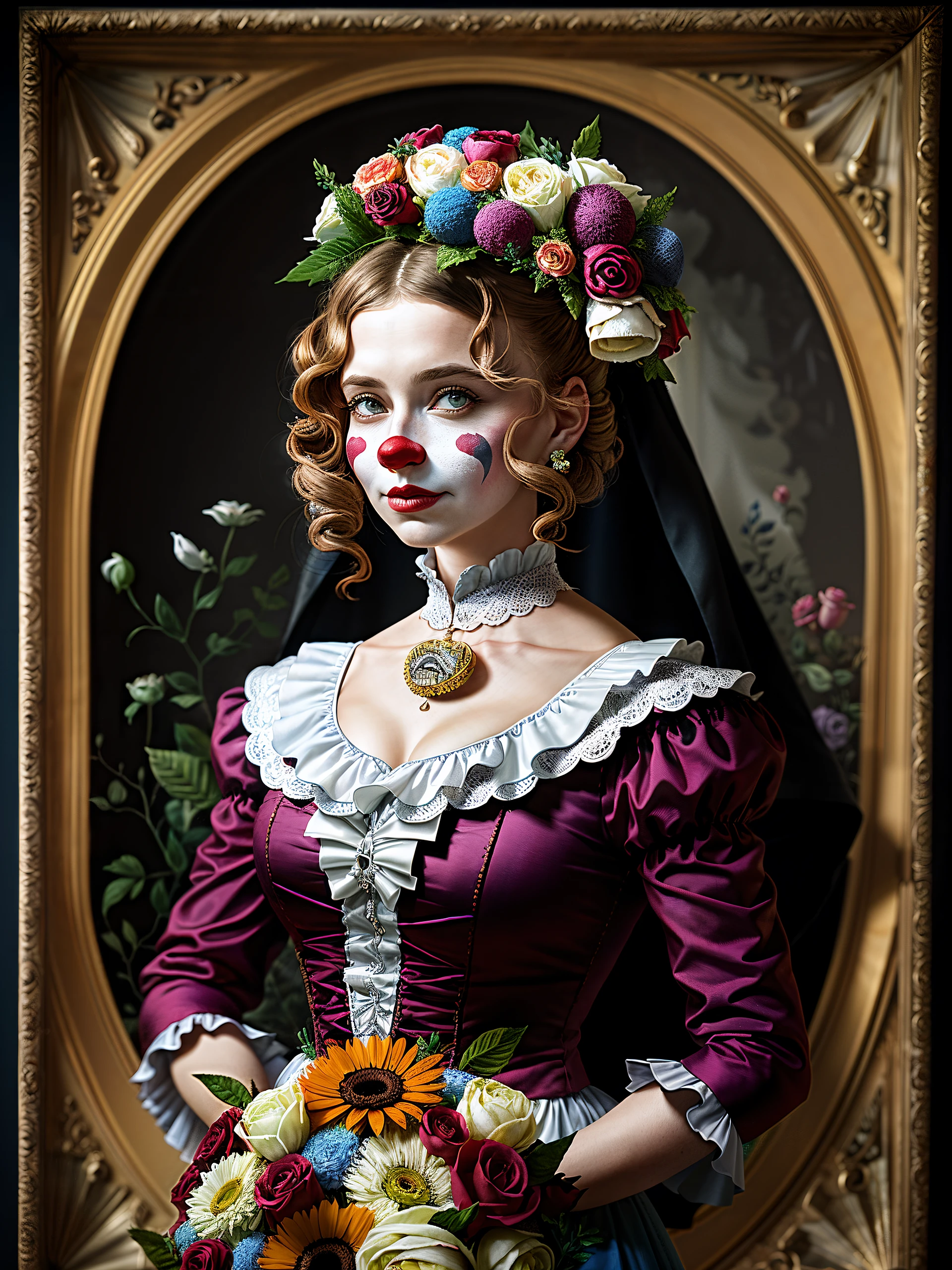 (Award Winning Masterpiece Image:1.2) , A (Victorian Clown:1.2) in a (Bridal Gown:1.2) made of flowers. Full-body. Hyper-detailed photographic portrait, Lomography photo, (style of Brian Froud, Style of Giuseppe Arcimboldo:1.1) , Pre-Raphaelite <lora:add_detail:1> , 16k, UHD, HDR, (Masterpiece:1.5) , (best quality:1.5) ,