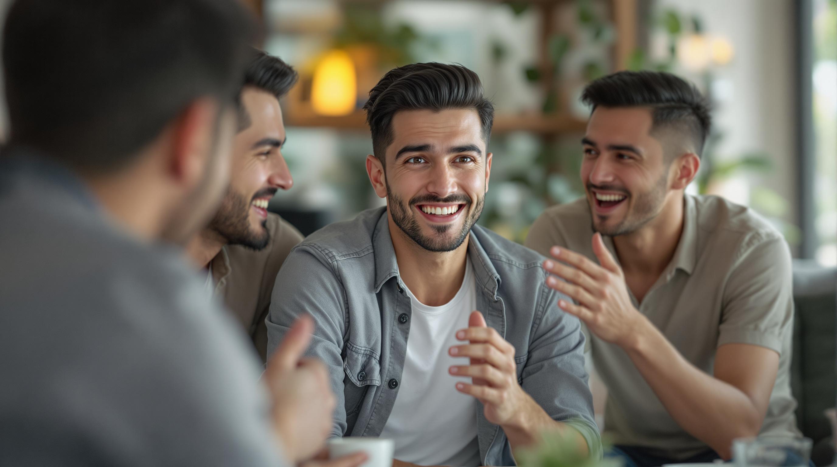 "Create an ultra-realistic, ultra 4K image showing men with a small group of friends playfully teasing him about being single. Depict men looking slightly embarrassed or pressured, while his friends laugh or gesture in a friendly, joking manner. The environment should be casual, such as a simple living room or café setting. Men has fair skin, a clean-shaven face, dark brown almond-shaped eyes, and neatly styled jet-black hair. Keep the lighting bright and natural, emphasizing the lighthearted, teasing mood."