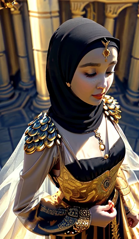 bracelet, brown eyes, china dress, earrings, facing away, flute, from above, lips, multiple girls, necklace, owl, playing instrument, puffy sleeves, solo, sunlight, sword, tiara, upper body, weapon on back, (((long sleeve dresses) ), (((closed chest) )), black eyes, closed body, face (((closed neckline) )), (((hijab) )), detailed eyes, (((closed shoulders) )), <lora:WLOP1:1>