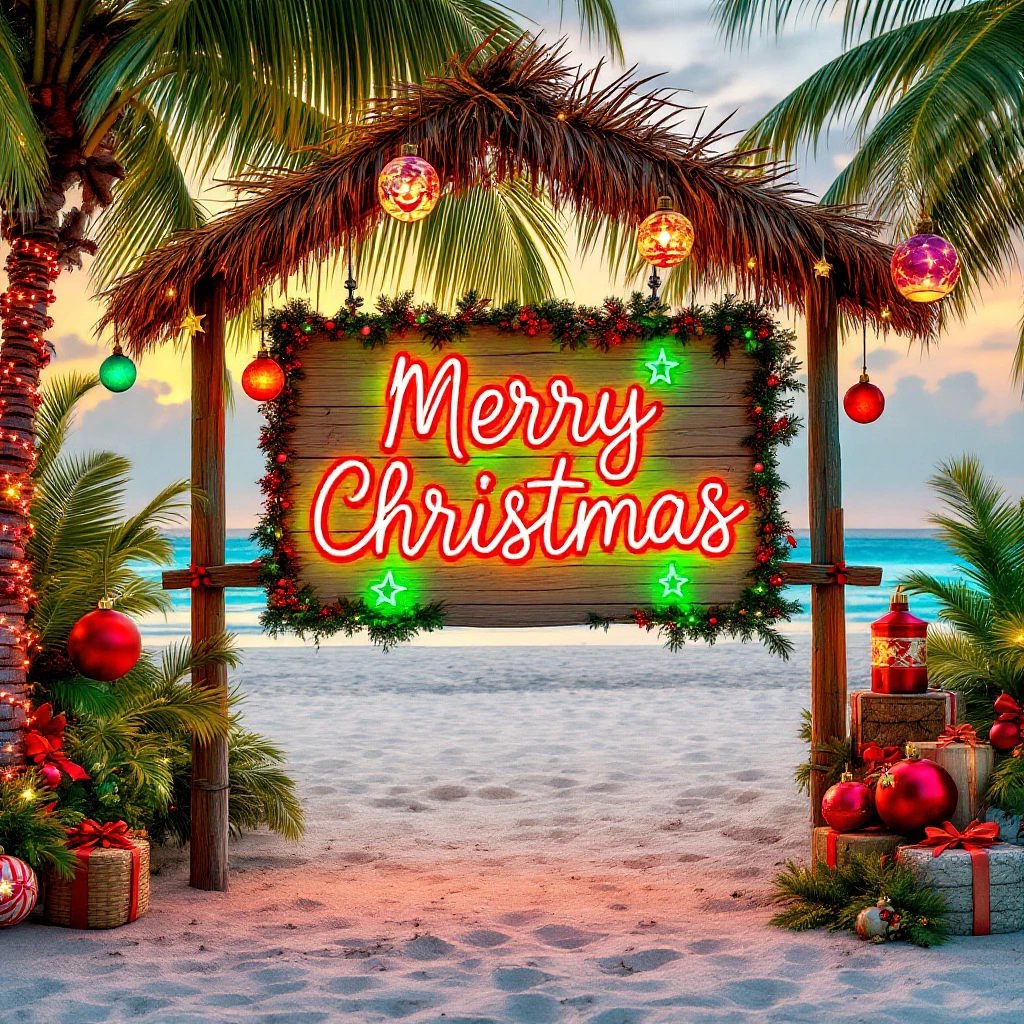 Beachy holiday scene, lots of Christmas decorations, thatched sign made of palm fronds, red and green neon letters saying "Merry Christmas All from Tonya & Joseph", sandy beach, tropical setting, festive, vibrant colors, cheerful, sunset lighting --ar 16:9 --v 6 --style raw