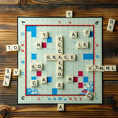 Create an image of a Scrabble game in progress on a wooden table. The Scrabble pieces should form the words "Tonya", "Gracie", "Stormy", and "Chanel", all interconnected on the board. The Scrabble board should be classic in style, with each letter tile clearly visible and the words neatly arranged in a linked manner. The table should have a rich, warm wooden texture, and the overall atmosphere should be cozy and inviting.