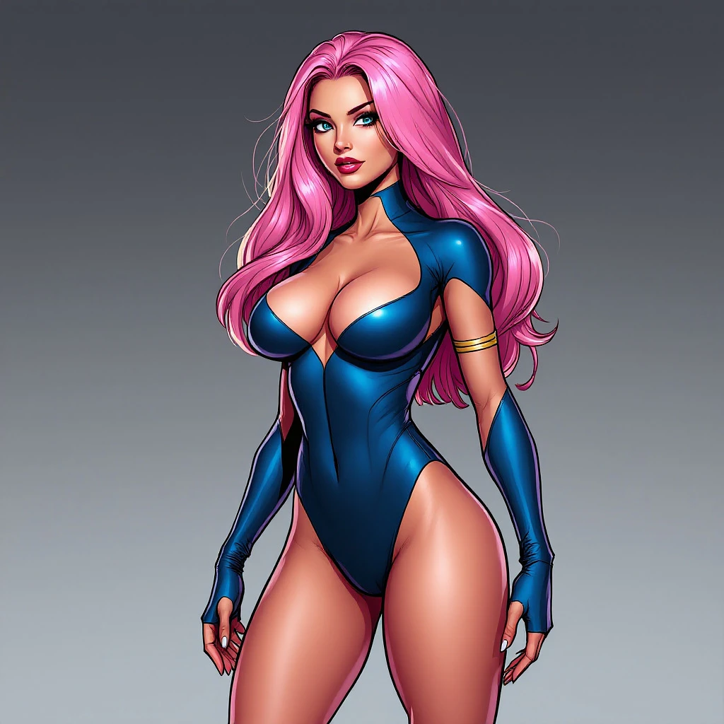 Atom Eve, from the comic and animated series "Invincible, " is known for her unique abilities, vibrant personality, and strong sense of justice. If we were to envision her with a more revealing and sexy aesthetic while still retaining her iconic looks and character essence, it might look something like this: **Physical Appearance**: Atom Eve has long, flowing hair that could be styled in soft waves or sleek and straight, depending on the desired effect. The color is a striking shade of pink or blonde, which contrasts beautifully with her skin tone. Her figure is athletic yet feminine, highlighting her curvaceous shape. **Outfit**: For a sexy twist on her costume, imagine a form-fitting, bold bodysuit that clings to her curves, accentuating her hourglass figure. The suit could feature strategic cutouts along the sides or back, with an emphasis on revealing a tasteful amount of skin while still being playful. The neckline dives low to highlight a generous, yet classy, display of cleavage, adding an alluring element to her appearance. **Color Palette**: The bodysuit could incorporate her classic color scheme of pink and yellow but with greater emphasis on the vibrant pink, potentially with glossy or metallic finishes that catch the light. Additional design elements, like sleek lines or patterns, could enhance the suit's contours, making her figure even more striking. **Accessories**: To complement her outfit, Atom Eve might wear subtle accessories—such as stylish bracelets or a choker—that accentuate her neckline. Her feet could be adorned with sleek, stylish boots, perhaps in a matching color to her suit but with a modern twist like high heels or fitted ankle boots to elongate her legs. **Aura and Personality**: With this revamped look, Atom Eve maintains her confident and assertive personality. Her captivating smile and sparkling eyes convey intelligence and charm. She stands out in any crowd, combining her heroic persona with an alluring charm that draws others in. Overall, this version of Atom Eve represents a blend of strength, confidence, and allure, capturing the essence of her character while embracing a more revealing and glamorous aesthetic.