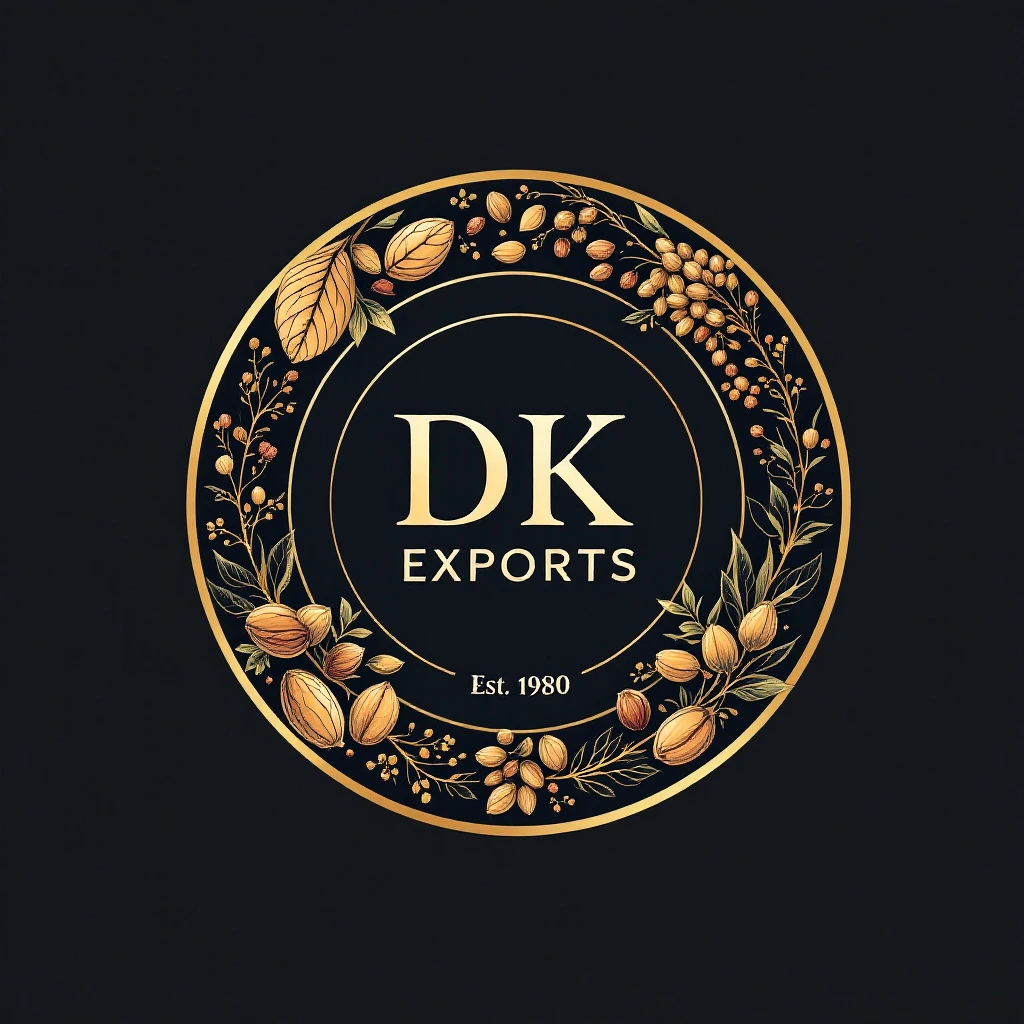 Design a professional logo for DK Exports, a global import-export brand specializing in nuts, seeds, and dried fruits. Use a circular emblem with luxurious golden accents on a dark navy or charcoal background. Place the initials DK prominently in the center, surrounded by detailed illustrations of nuts and seeds. Include 'Est. 1980' as a subtle accent within the design. The logo should be elegant, timeless, and versatile for various branding applications
