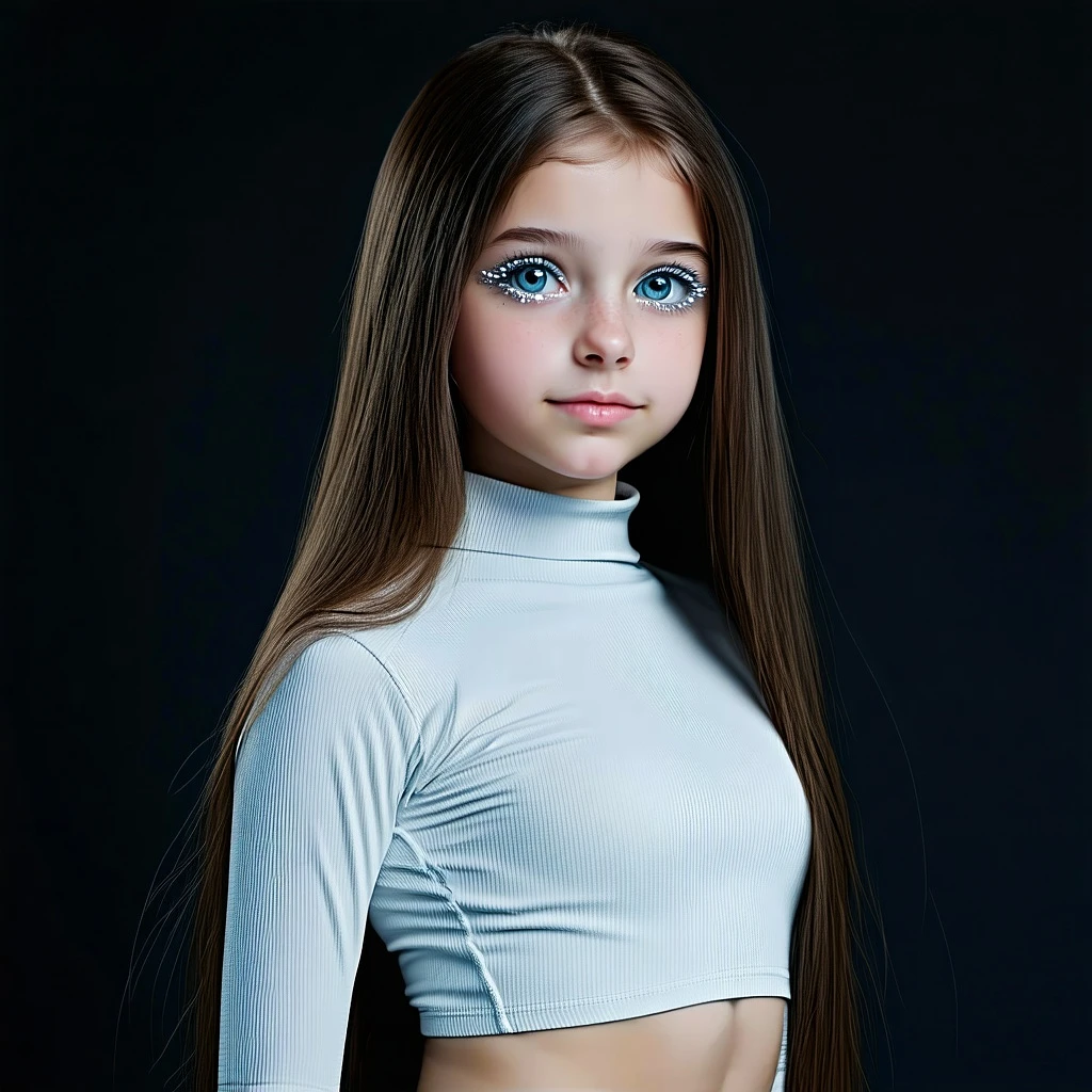 a professional photo of a exceptionally beautiful girl in the world, (age 15) (futuristic) , (masterpiece) , (realistic) , (perfect anatomy) , (Full body viewing from head to feet) with extremely long dark Ash Blonde hair, flawless olive skin, thick silver eye liner, extra long eye lashes, light pink blush, extremely beautifully shaped lips with light apple lipstick, blue eye shadow, flawless light olive skin, extremely detailed large beautiful brilliant Forest Tea red-green-blue-silver-brown-golden-grey eyes, (dressed in a light blue dance top, and black skinny spandex bike shorts) standing in a dance studio, with a full wall mirror behind her, high depth of field, gentle expression, 8k, (high res) , ultra-detailed, photo-realistic, full image view, full body view, front view, highly detailed, volumetric, dramatic lighting