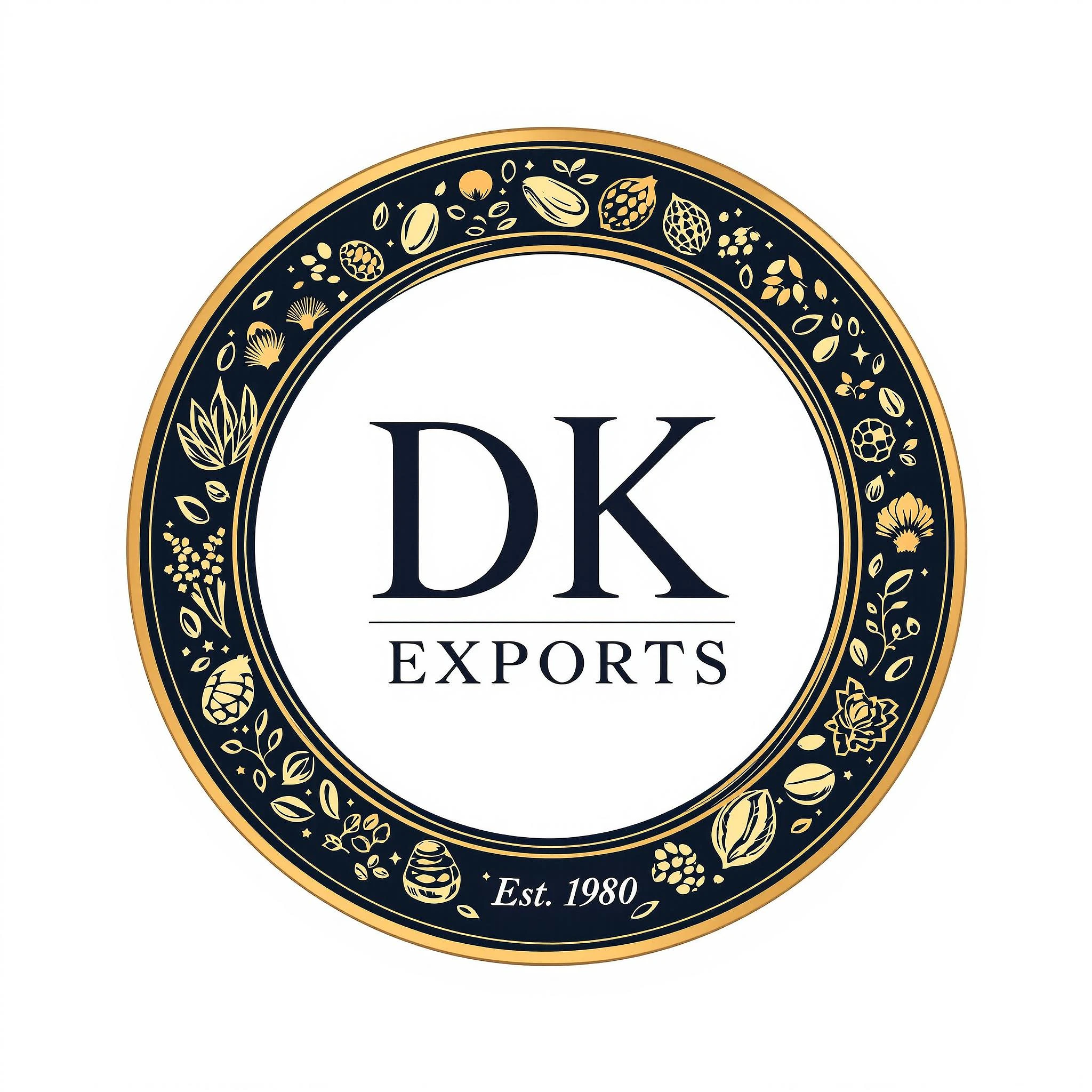 Design a professional logo for DK Exports, a global import-export brand specializing in nuts, seeds, and dried fruits. Use a circular emblem with luxurious golden accents on a dark navy or charcoal background. Place the initials DK prominently in the center, surrounded by detailed illustrations of nuts and seeds. Include 'Est. 1980' as a subtle accent within the design. The logo should be elegant, timeless, and versatile for various branding applications