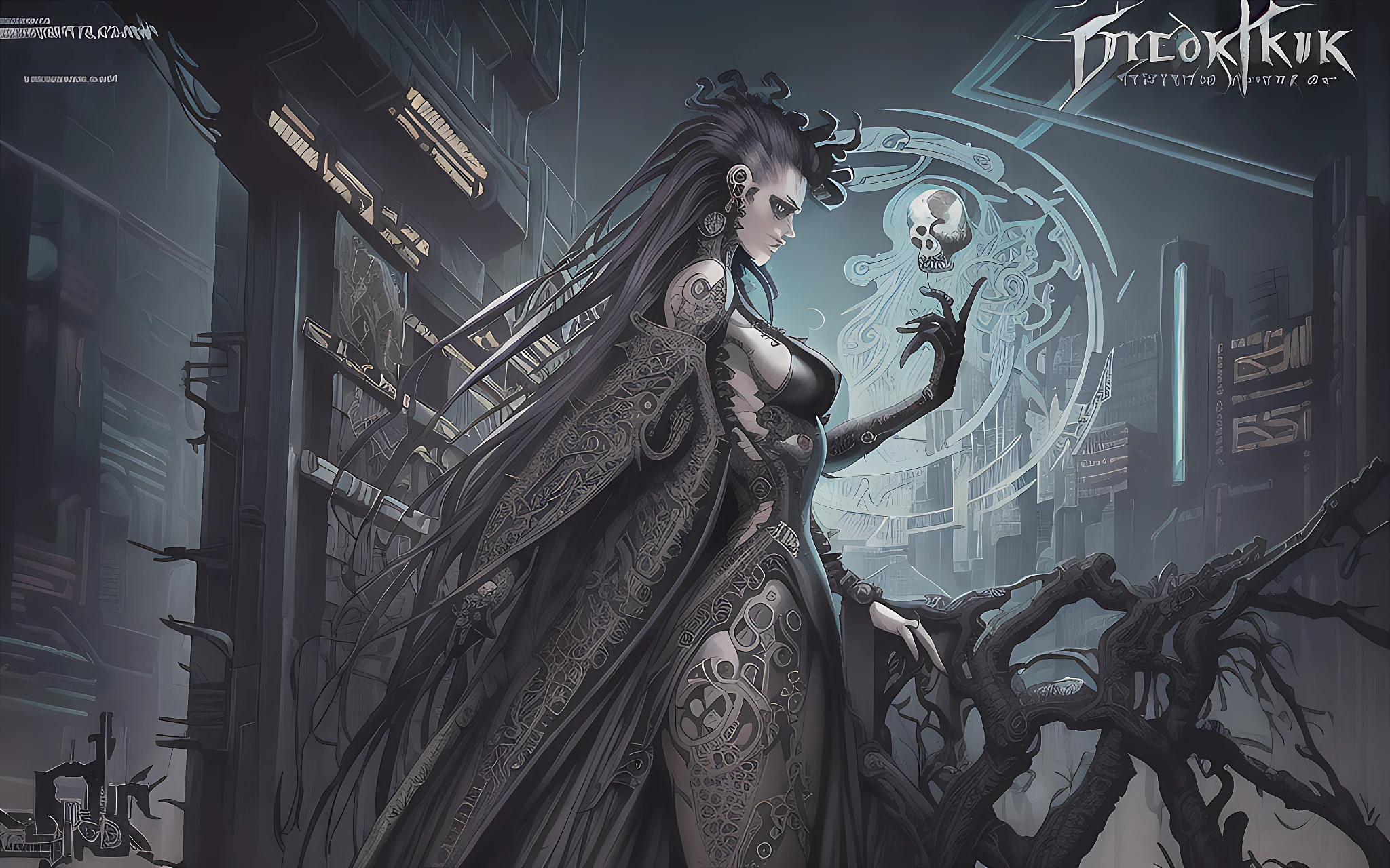 tarot card with intricate detailed frame around the outside | side profile of cyberpunk body with cyborg skull | cyberpunk | styled in Art Nouveau | insanely detailed | embellishments | high definition | concept art | digital art | vibrant