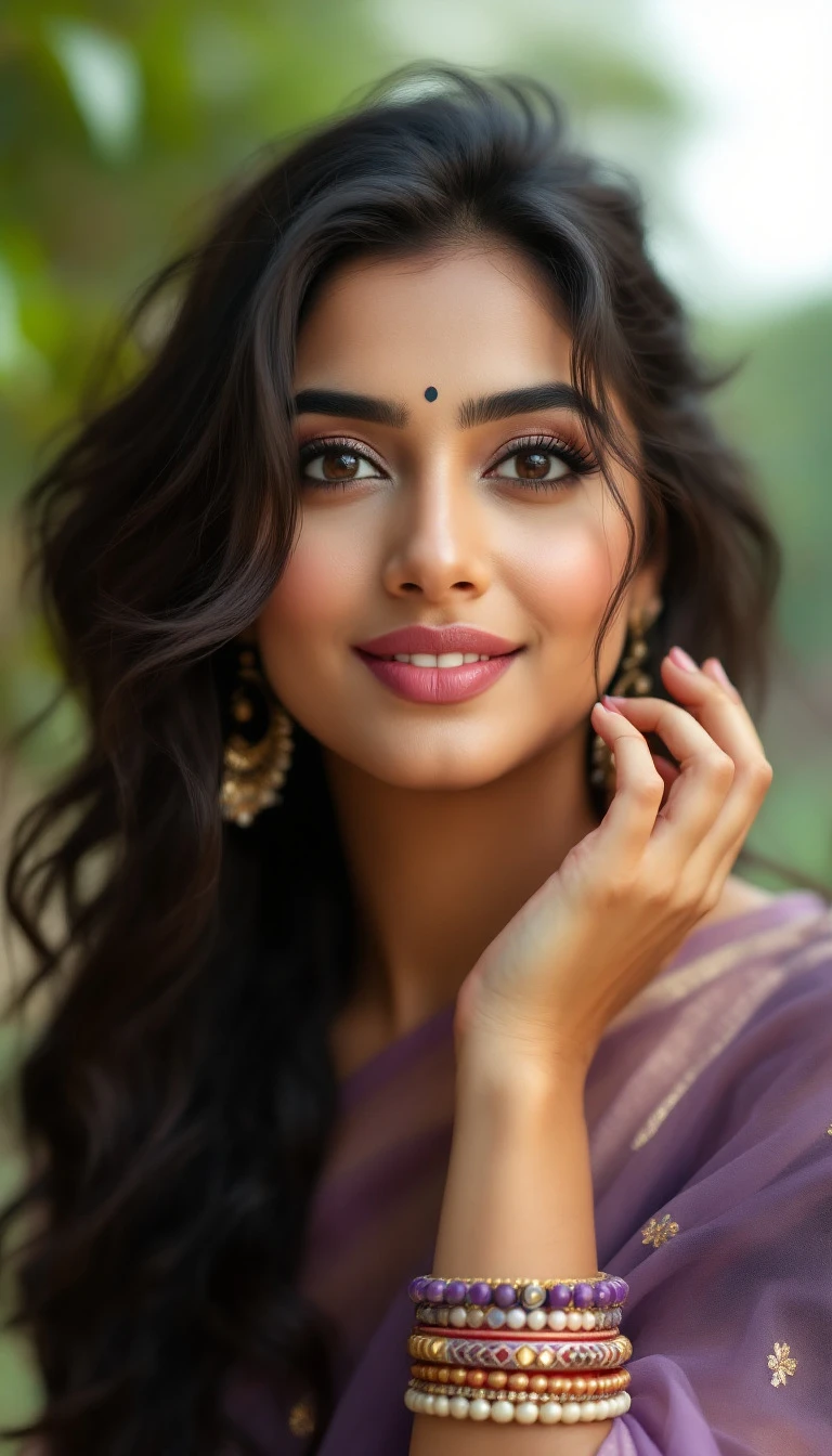 Kriti Shetty, 24-30 years old, Indian hair style, trying to love, inhaled chest, wide open eyes, A plus curvy shaped body structure, showing bangles on hand, bindi, high-quality photo portrait, shot on a Kodak camera, photography, environmental, double eyelid --ar 34:65 --style raw, indian ascent, flying kiss, feeling happy, beautiful legs, wearing violet transparent sari with black silk blouse, includes full body structure, bedroom body, Mwah, A plus huge swollen boobs.