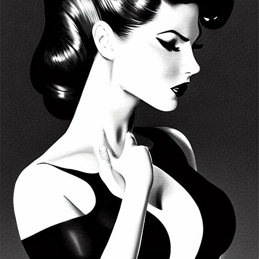 beautiful woman pinup, black and white in the style of alex ross, wearing a tight black dress, black hair ponytail, holding a pie, 2 d, 4 k, unreal, intricate, digital painting, highly detailed, artstation, sharp focus, illustration,